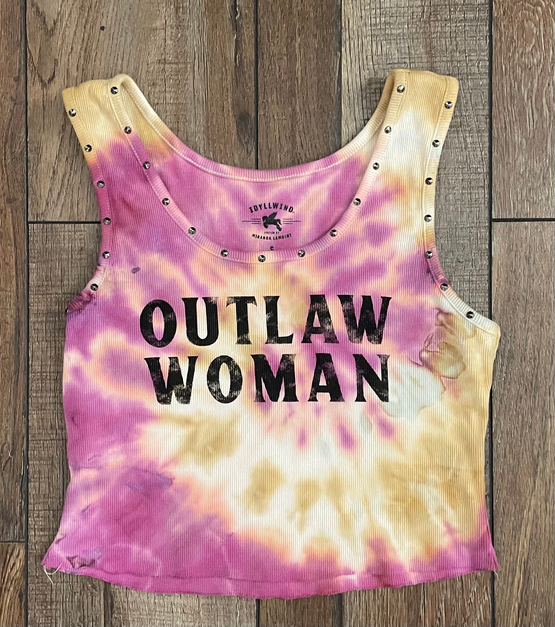 A cropped graphic tank from Idyllwind with studded details that has been hand tied and dyed for a 1/1 summer tank!